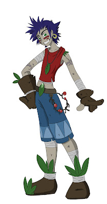 This is the original design that i sketched out before fleshing the design out, I wanted him to look like a jungle boy or tribal character that had generally scruffy nature clothing and messy hair.This is the finalised refined design that I made for him, he has less scruffy clothing though it is more nature related with a chain made of twig and cherry branches, also leafy clothing and jewellery.